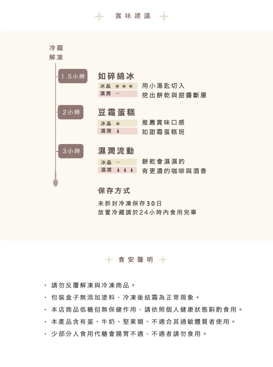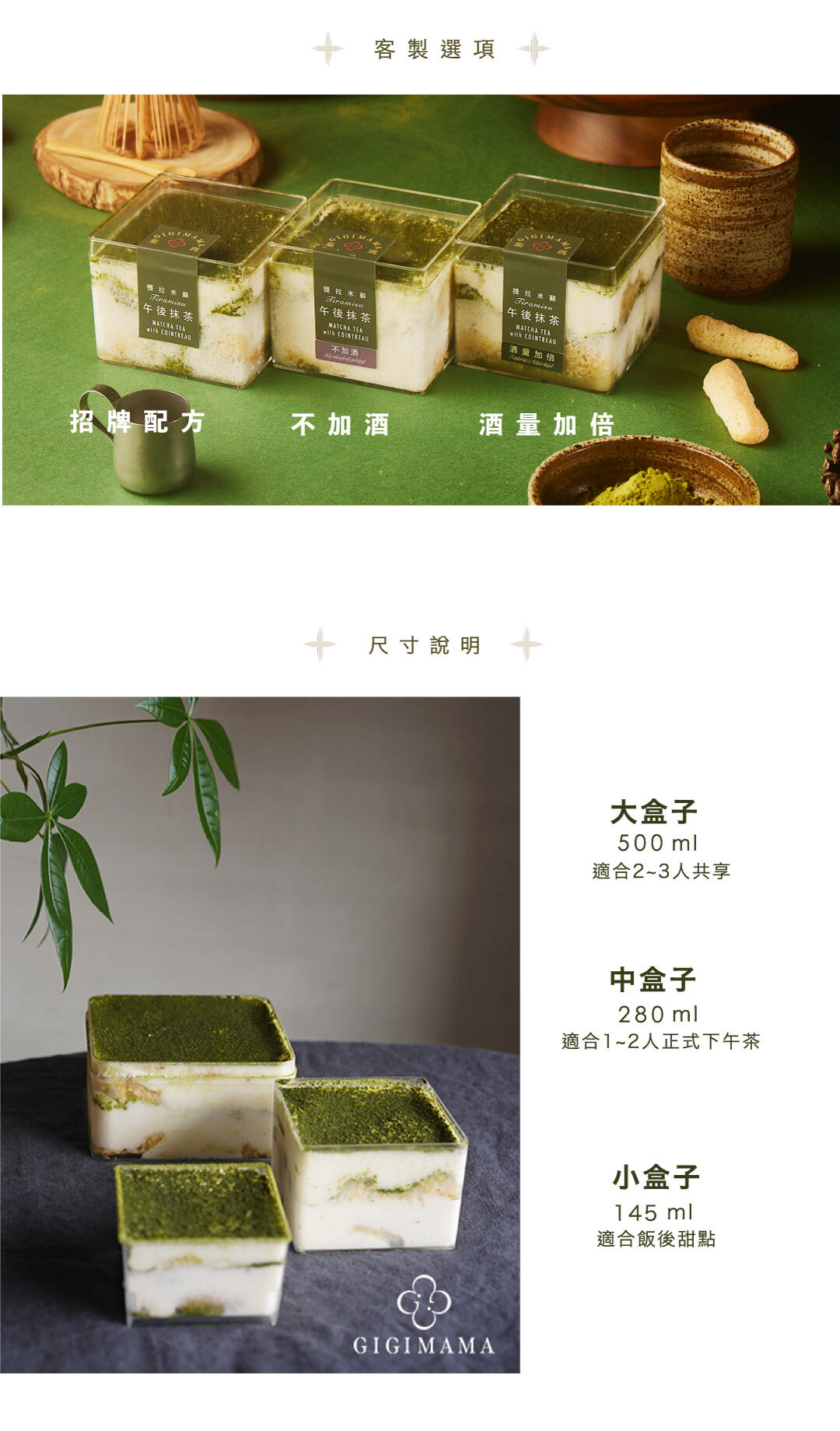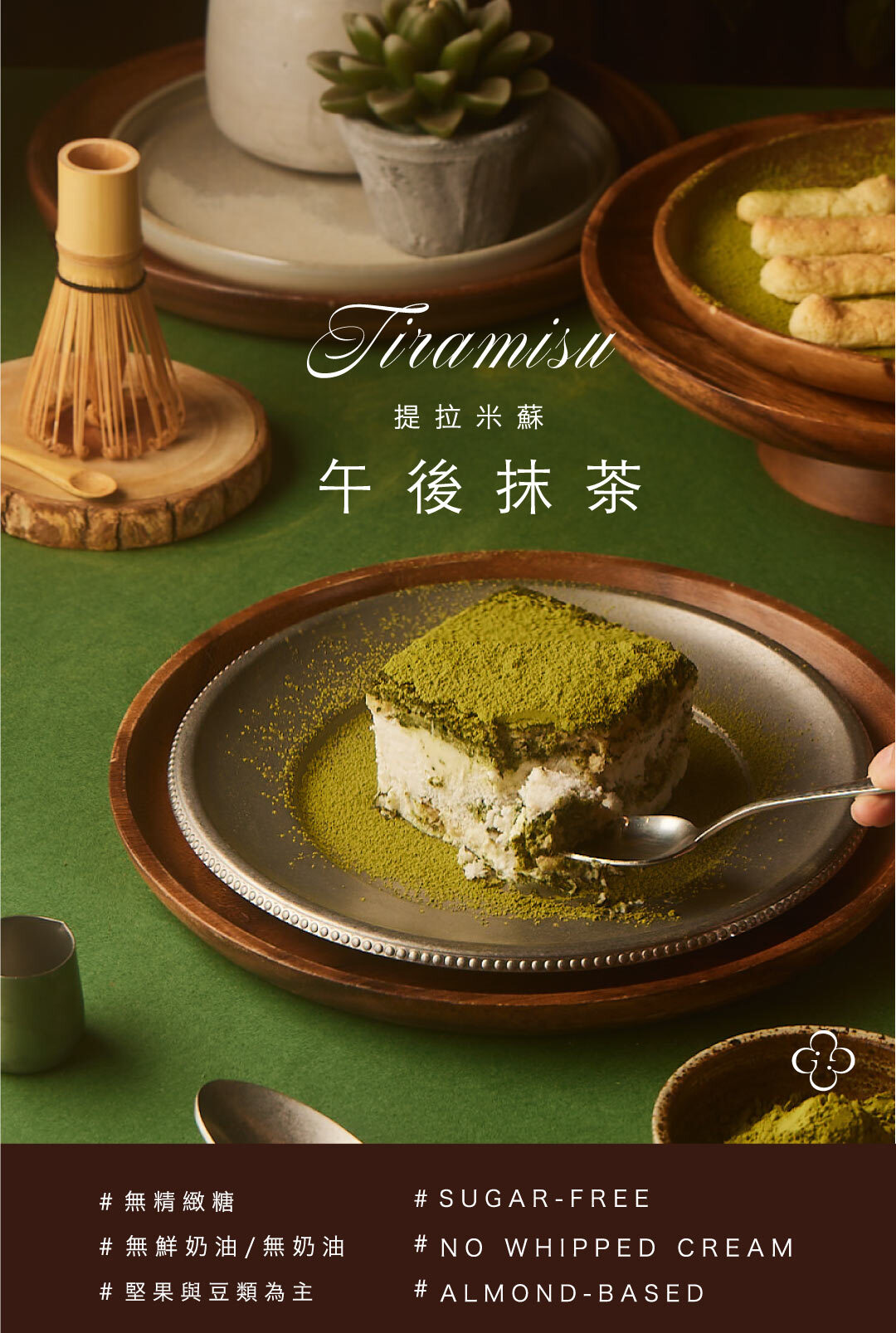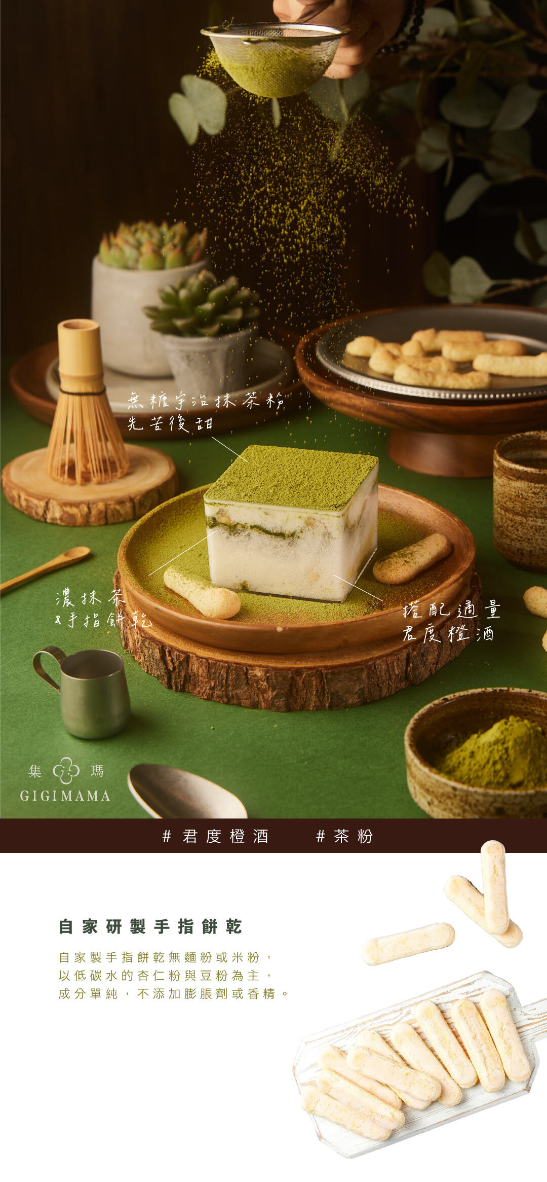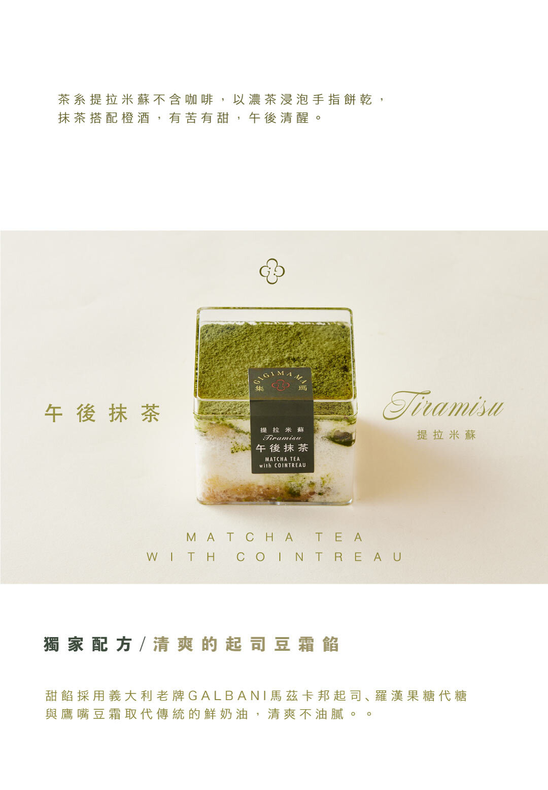 提拉米蘇的變化式——茶拉米蘇・以宇治抹茶為主調,融合橙酒的細緻果香,呈現微苦微甜、層次平衡的風味。甜餡選用不含精緻糖與精緻澱粉的配方,以馬茲卡邦起司搭配風味獨特的豆霜,口感細緻清爽。手指餅乾為自家研發的堅果蛋糕擠製烘烤而成,質地較麵粉製品更為紮實、不蓬鬆。整體低糖、清爽,適合喜愛苦抹茶甜點,不偏好厚重甜味的你。