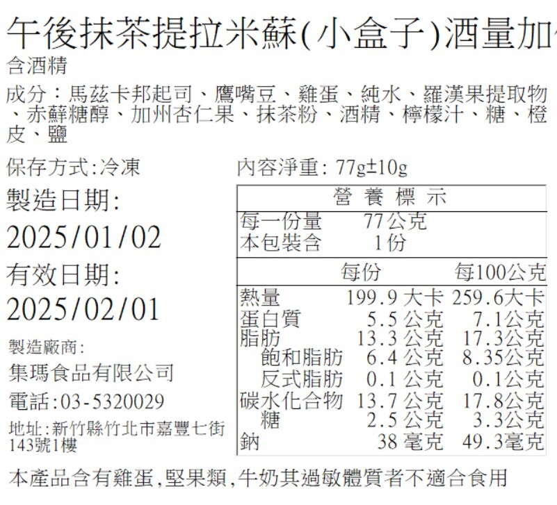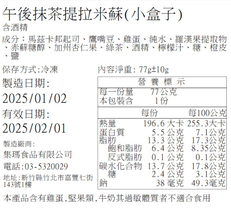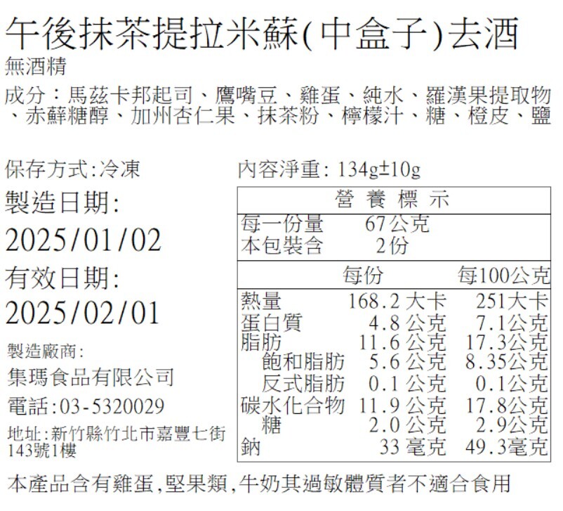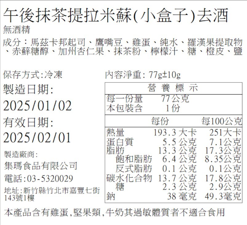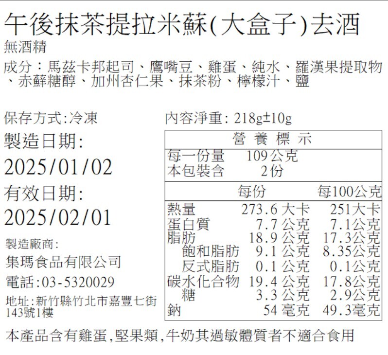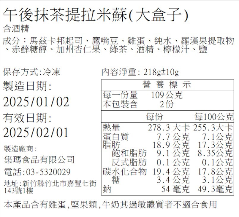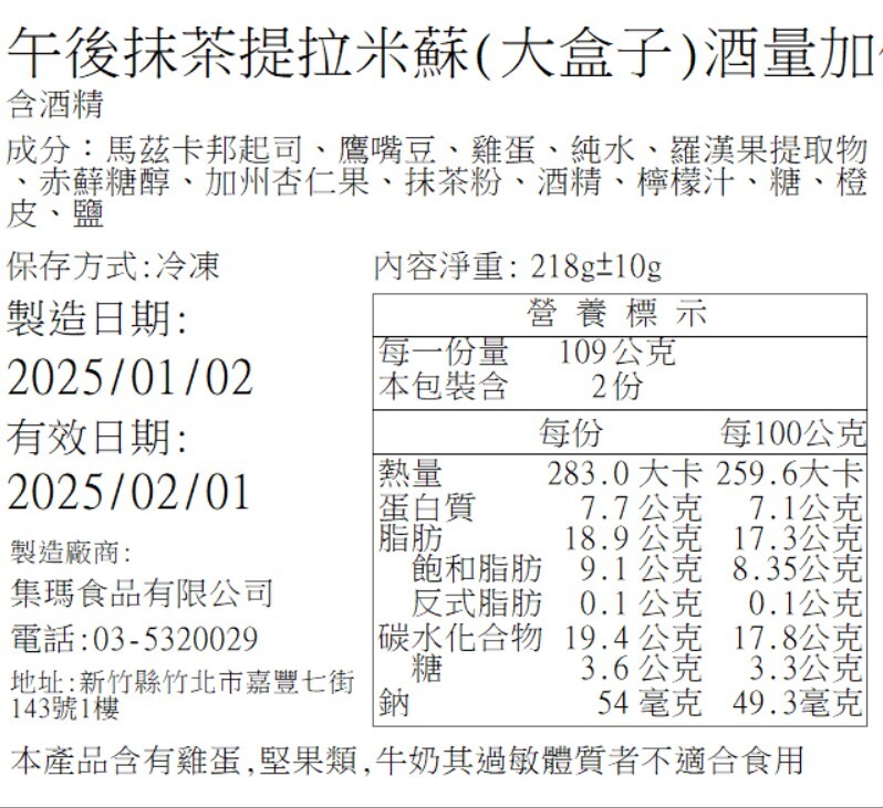 營養標籤 (日期以出貨為主,圖示為營養標內容示意)