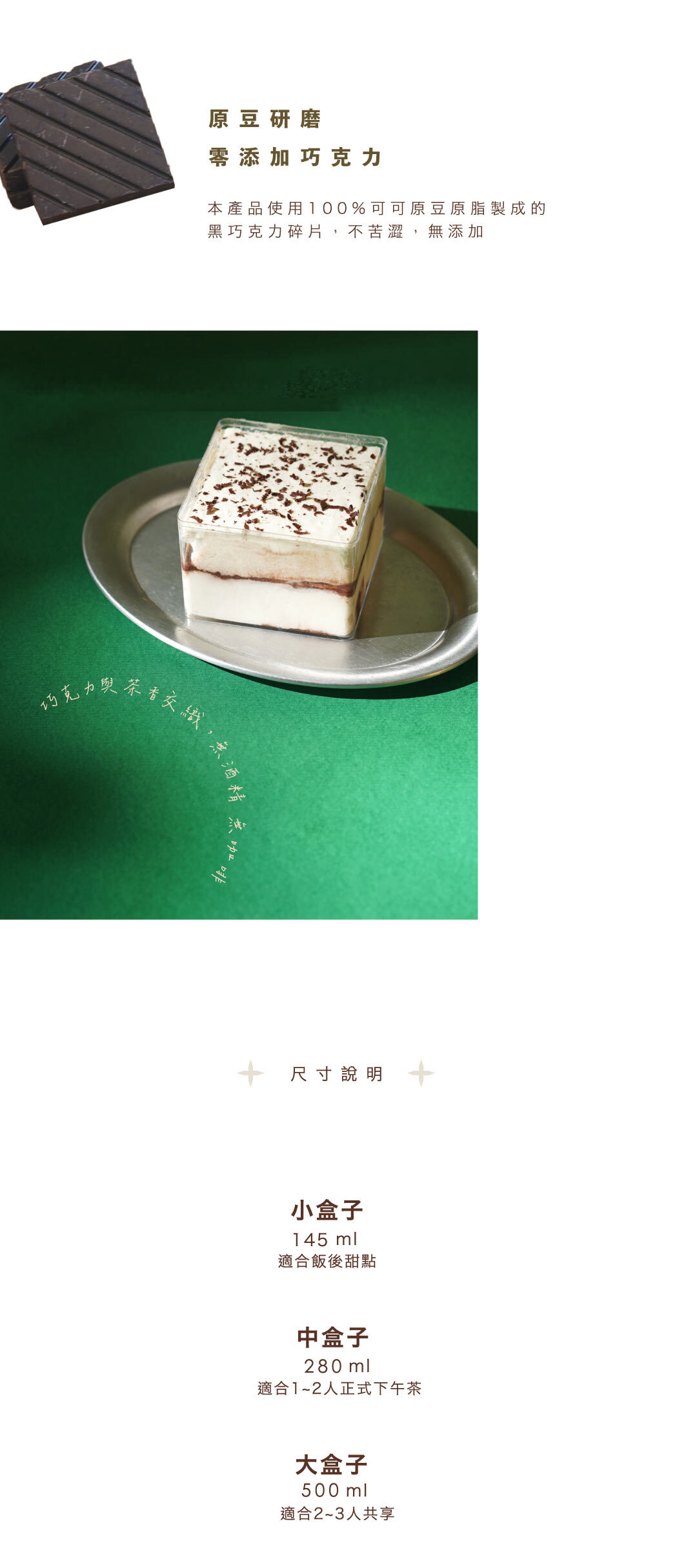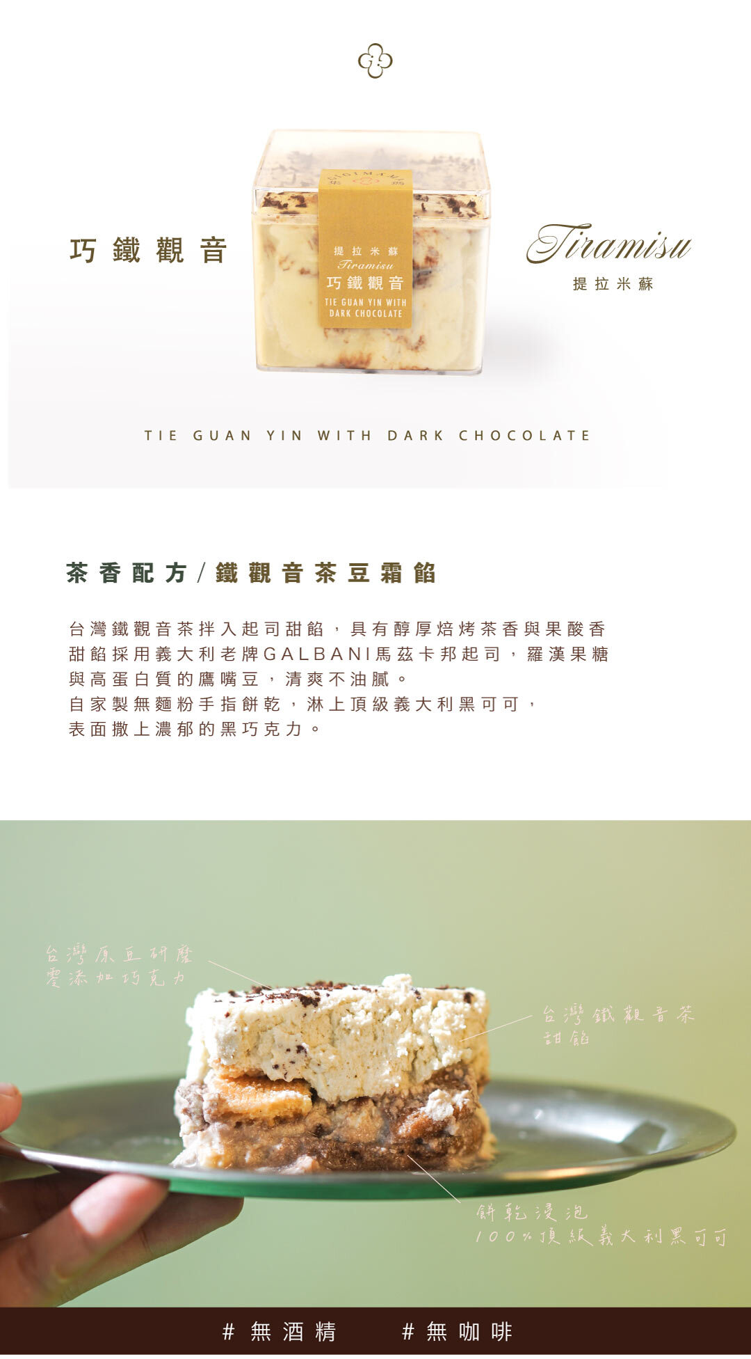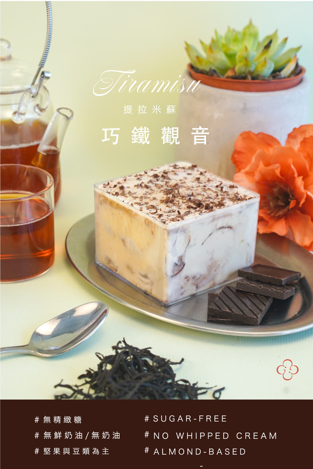 鐵觀音的深沉茶韻,與細碎巧克力交織出層次豐富的口感,為提拉米蘇注入全新的風味想像,濃郁而迷人。底層以自家研發的堅果蛋糕為基底,淋上濃黑可可,搭配鐵觀音豆霜,茶香在口中緩緩展開。無添加砂糖、無麵粉,低糖卻依然保有飽滿的堅果香氣與成熟茶味。