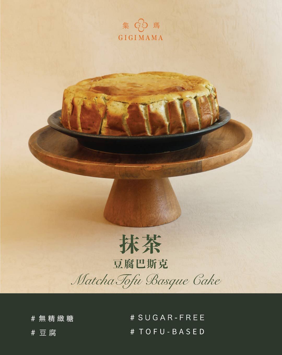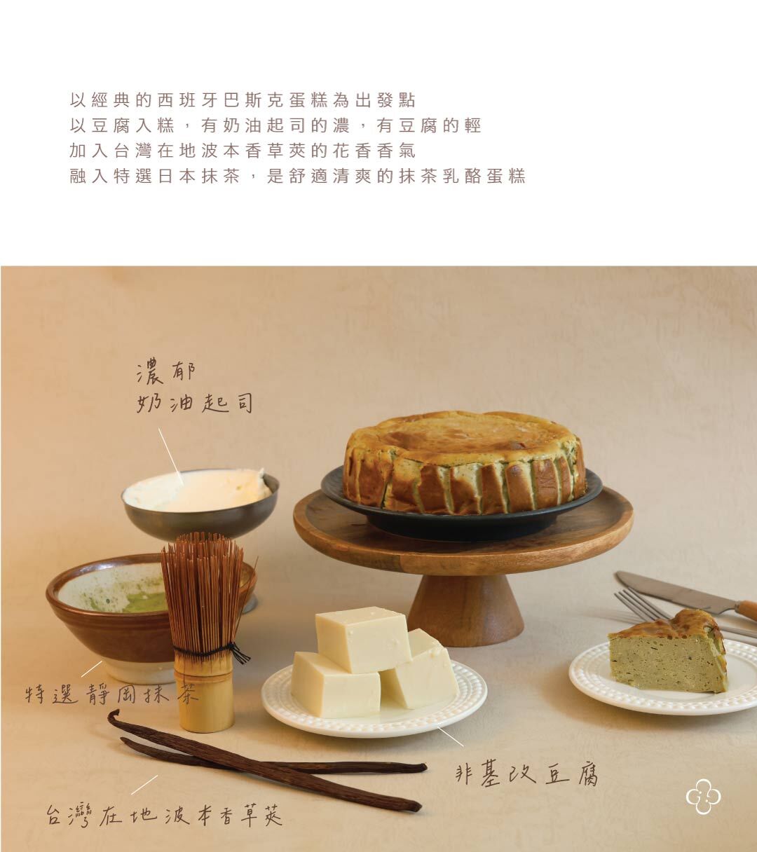 以經典巴斯克為靈感,重新詮釋成低糖版本。質地比傳統巴斯克更鬆軟、以豆腐取代鮮奶油,不厚重。選用台灣栽種的波本香草莢籽,帶出自然細緻的花香,不添加香草精或其他澱粉,讓味道回到單純本身。融入特選靜岡抹茶,微甜的茶香起司蛋糕。#宅配以冷凍出貨 #四寸與六寸 #無加精緻糖 #無麵粉#蛋奶素