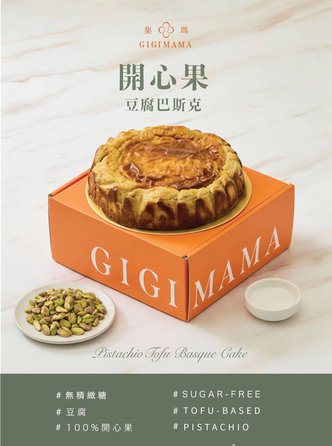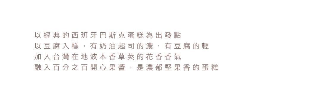 以經典西班牙巴斯克為靈感,將豆腐融入糕體,保留奶油起司的濃郁,同時多了一份輕盈口感。搭配台灣波本香草莢的細緻花香,使用純無添加的開心果醬,風味自然純粹。