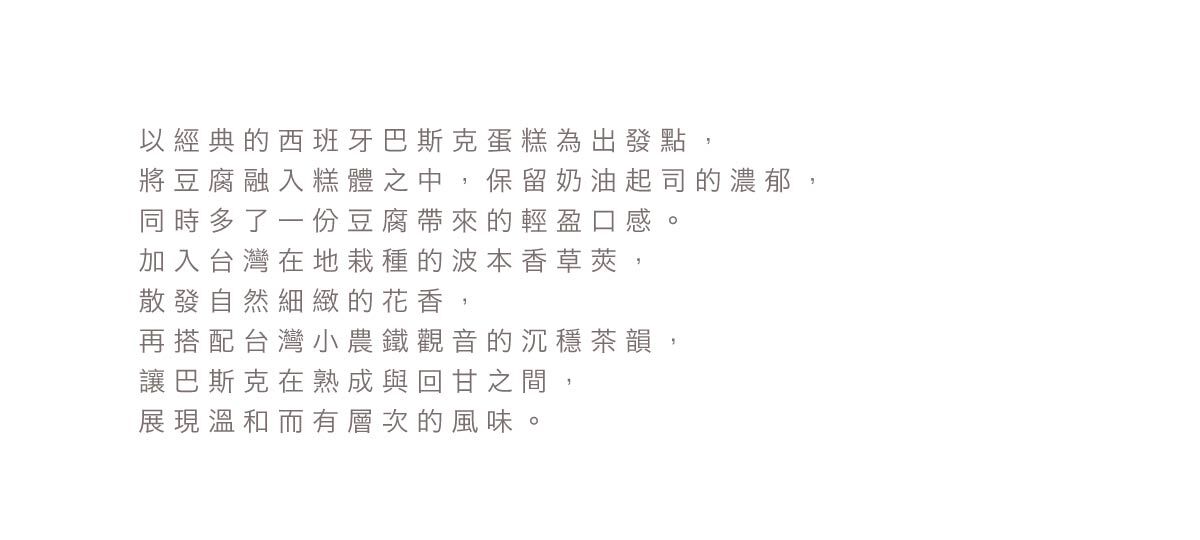 以經典西班牙巴斯克為靈感,將豆腐融入糕體,保留奶油起司的濃郁,同時多一份輕盈口感。搭配台灣波本香草莢的細緻花香與台灣小農鐵觀音的沉穩茶韻,風味溫和、層次分明。